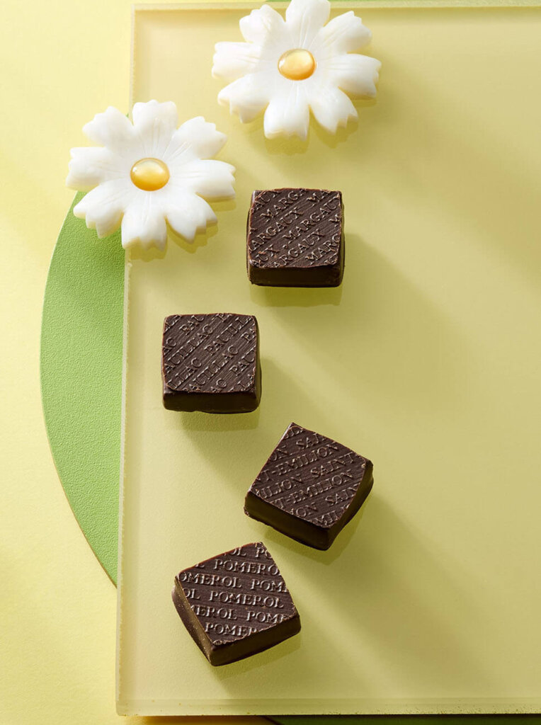 4年の歳月を施し考案、特許を取得した格付けワインのみを使用した唯一無二の“ワインガナッシュ”。ボルドー右岸・左岸各2種のワインのショコラを詰めた限定品を販売。まるで泡のようなフワモチ新食感のショコラも登場します。