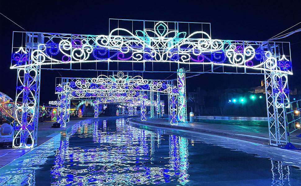 2025年は、海の中をイメージしたイルミネーションドーム「マリンファンタジア」が新登場!海のモチーフが映し出される3つのイルミネーションドームを青く煌めくトンネルで繋ぎ、「光」と「水」の幻想的な世界が表現されています。ドームの中を歩きながら、まるで海の中を歩いているかのような没入感を楽しんでください。