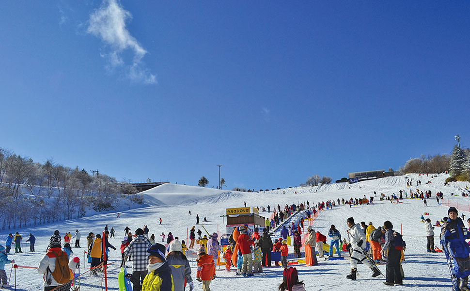 標高1350mの山頂から最長3500mを一気に滑り降りられます。9本のコース設定は、ファミリーから上級者まで幅広く楽しめるゲレンデが魅力です。キッズパークは、屋根付きの動く歩道で小さな子供も安心して遊べます。またスキーの後は、ゲレンデに隣接する温泉宿「満天の宿」「ホテルヴィラ・ウイング」でゆったり温泉が楽しめます。