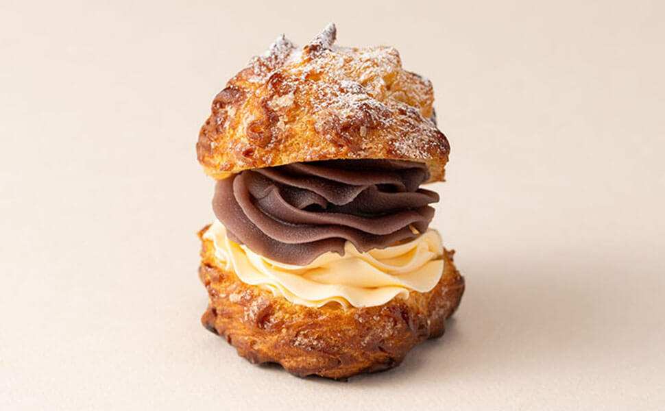 SHIRUKOTTE限定シュークリーム。松ぼっくりのような見た目のモッチリとしたシュー生地にあんことバタークリームの今までにないコクを味わえる贅沢なシュークリームです。