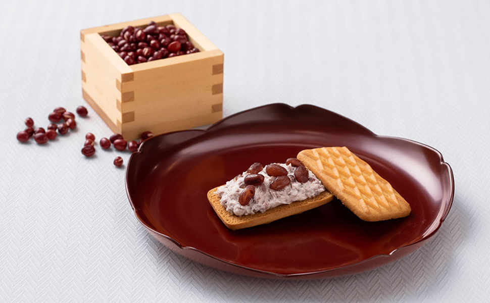 生しるこサンドの冬限定フレーバー。しっとりとしたビスケットにあんこクリームをサンドし、濃厚なチョコレートで包み込んだ新感覚和洋折衷スイーツ。