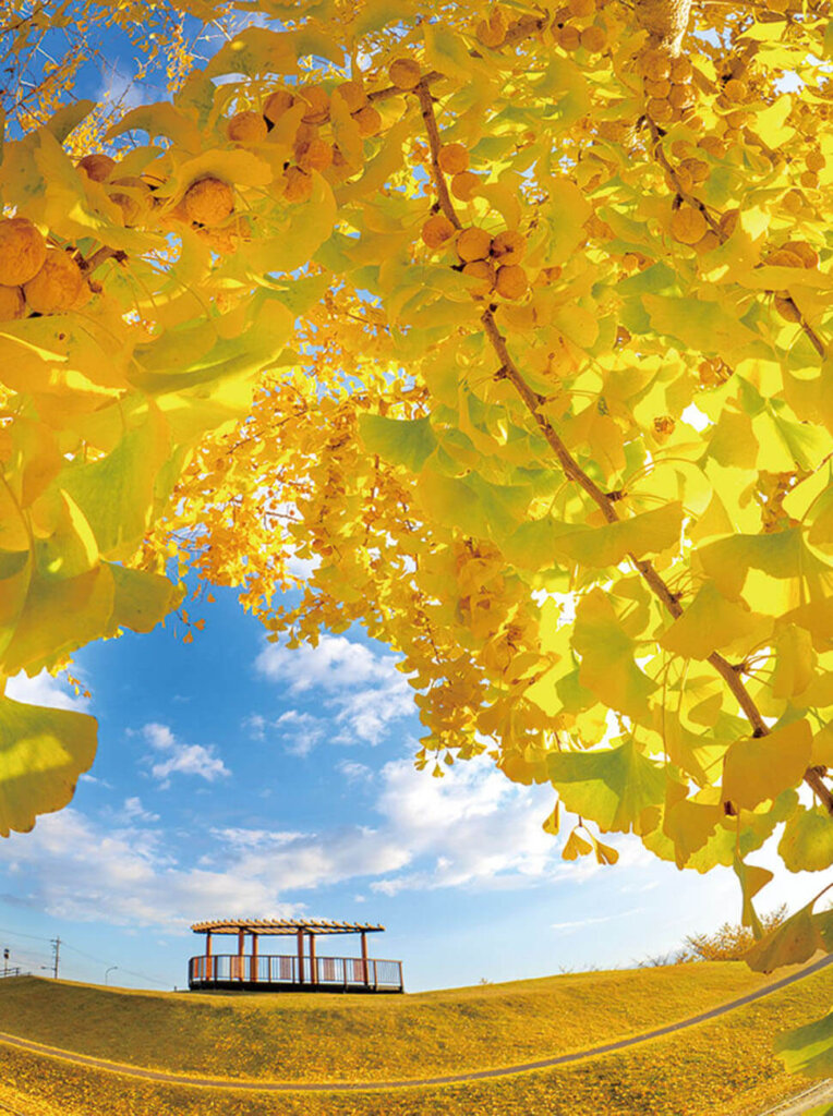 愛知県稲沢市祖父江町は、日本有数のぎんなん産地。町内には樹齢100年を超える大木が数多く存在します。11月中旬~下旬には1万本以上のイチョウが黄葉し、祖父江町山崎地区を中心に町全体が黄金色に染まります。